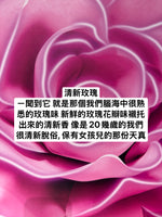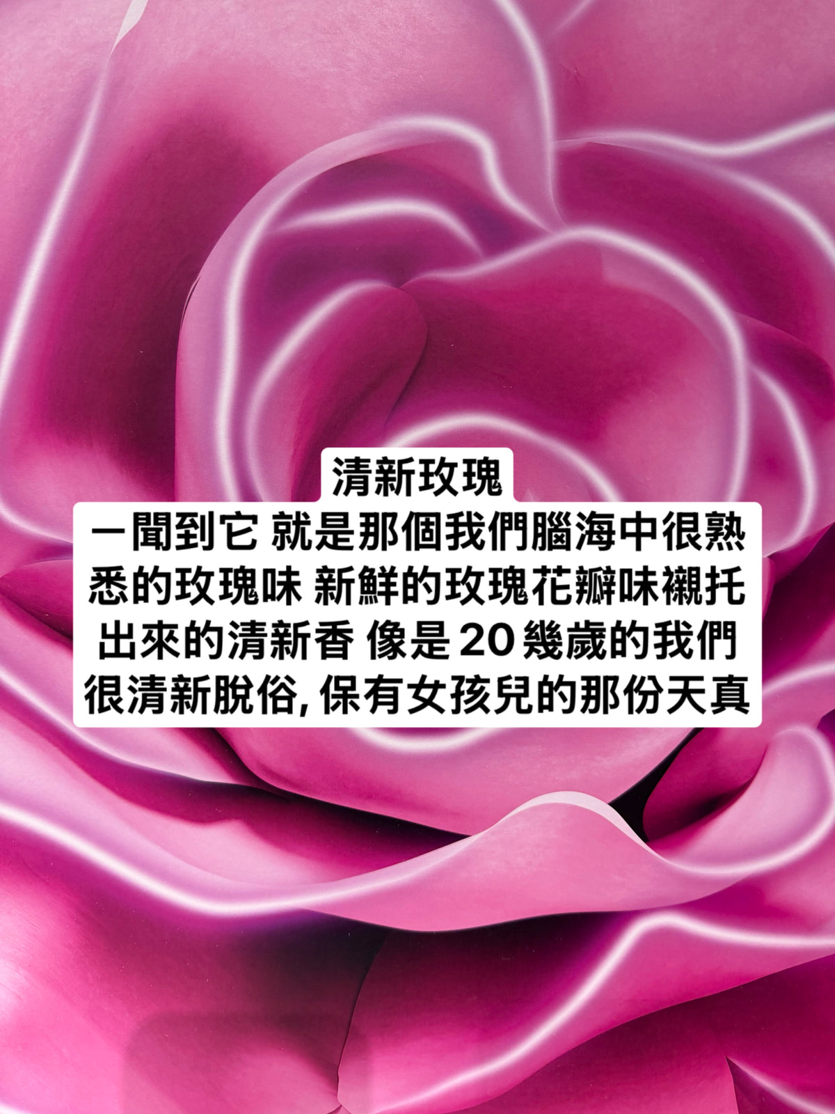 Ann的香香筆記ㄧ聞到它 就是那個我們腦海中很熟悉的玫瑰味 新鮮的玫瑰花瓣味襯托出來的清新香 像是20幾歲的我們 很清新脫俗, 保有女孩兒的那份天真